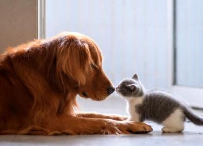 خبرنگاران: یک بچه گربه به سگ بالغ ابراز محبت کرد.